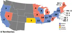 The results of the 1864 United States presidential election in the novel. The blue states are those won by Seymour/Vallandigham, the red states won by Lincoln/Hamlin, light gray states won by McClellan/Everett, yellow states won by Fremont/Johnson while dark gray represents the US territories