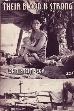 In 1938, the feature-story articles were published as the pamphlet Their Blood Is Strong, by the Simon J. Lubin Society, a non-profit organization dedicated to educating Americans about the socio-economic plight of the migrant worker. The pamphlet included the seven articles, plus Steinbeck's new epilogue "Starvation Under the Orange Trees" and twenty-two photographs of the migrant workers, by Dorothea Lange;[2][3] ten thousand copies of Their Blood Is Strong were sold at twenty-five cents each.[4]