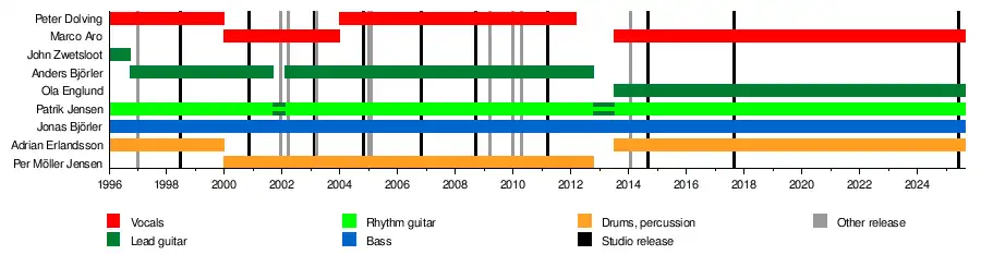 The band currently consists of Marco Aro (vocals), Patrik Jensen (rhythm guitar), Ola Englund (lead guitar), Jonas Bjorler (bass), and Adrian Erlandsson (drums).[1][2][3][4]