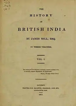 The History of British India is a three-volume work by the Scottish historian, economist, political theorist, and philosopher James Mill, charting the history of Company rule in India. The work, first published in 1817, was an instant success and secured a "modicum of prosperity" for Mill. Mill categorized Indian history into the Hindu, Muslim and British periods on the basis of dominant political powers and their religious affiliations.[1] Mill noted that he had never been to India and was unable to speak any Indian languages, though he claimed that this improved the work's moral objective. In the work, Mill frequently denounced Hindu culture and traditions, and it has been seen by historians as an example of anti-Indian sentiments in Britain during the period.[2]