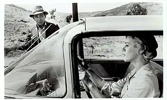 She takes a side road in New Mexico but becomes stranded when she runs out of gas. She reaches a gas station on foot but it is closed; although she rouses the proprietor from bed, he refuses to reopen and sell her gas due to the late hour. Nan is startled by a sailor on his way back to San Diego from leave. Eager for protection from the hitchhiker, she offers to drive the sailor all the way to his destination. He gladly accepts and persuades the station attendant to provide gas. As they drive together and discuss their mutual predicaments, she sees the hitchhiker on the road and swerves toward him. The sailor, who cannot see him, questions her driving; she admits she was trying to run over the hitchhiker. The sailor begins to fear for his safety and leaves her despite her efforts to have him stay, even going so far as offering to go out with him.
