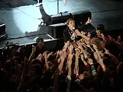 The Hives are renowned for their energetic and highly rated live shows, with Spin ranking them number eight on their list of best live bands in 2006 and frontman Howlin' Pelle receiving particular praise for his showmanship.[54][3][55] When asked about their efforts to connect with the audience, drummer Dangerous replied that "there are so many bands out there that don't say a word to the crowd. I don't get it. They don't even look at the audience and that's ridiculous".[56] In 2023, Howlin' Pelle commented on the effects of their live shows saying "we give so much energy and then it kind of bounces right back. So on one hand your body gets tired but your soul feels better and better. So it's not just tiring, like it also gives you a lot of energy".[57] The Hives always dress in matching black-and-white tuxedos because "it makes [them] look like [they] belong together".[58]