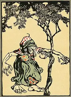 The prince (in snake form) coils around the princess (in tree form) and faces his Dev-mother. Illustration by William Pogany for a 1913 book.