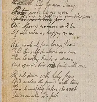 In a draft version of "The Human Abstract" (under the title "The human Image") the word "Pity" of the first line is written instead of the word "Mercy". The second line "If we did not make somebody poor" in the first version was written above the struck-through line "If there was nobody poor".