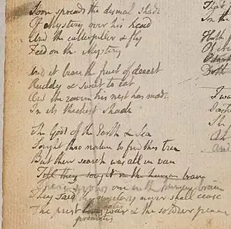 The poem was engraved on a single plate as a part of the Songs of Experience (1794) and reprinted in Gilchrist's Life of Blake in the second volume 1863/1880 from the draft in the Notebook of William Blake (p. 107 reversed, see the example on the right), where the first title of the poem The Earth was erased and The human Image substituted.[4] The title The Human Abstract appeared first in the Songs of Innocence and of Experience. In the commentary to his publication of the Songs of Innocence and of Experience, D. G. Rossetti described this poem as one of "very perfect and noble examples of Blake's metaphysical poetry".[5]