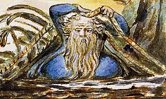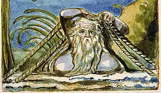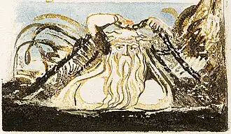 The illustration shows a gowned old man with a long beard who kneels with his legs outspread. He raises his arms to grip the ropes as if he tries to free himself. There is a tree trunk with a broad base on the right and the edge of another on the left. The colour of the sky suggests sunrise or sunset. A muddy river runs along the lower edge of the design in front of the man. The picture portrays the supreme God of Blake's mythology and the creator of the material world, whom Blake named "Urizen" (probably from your reason), struggling with his own nets of religion, under the Tree of Mystery, which symbolically "represents the resulting growth of religion and the priesthood (the Catterpillar and the Fly), feeding on its leaves".[6]