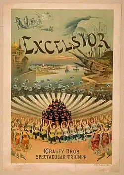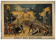 In August 1873, the brothers first produced their own musical spectacle, a revival of The Black Crook at Niblo's Garden. They added musical numbers, improved the costumes (beyond exposing the legs of the actresses), and strengthened the dance numbers. According to Bolossy Kiralfy, their revival was an immense success, playing over one hundred performances before going on tour and breaking Niblo's Garden's record number of performances of a revival.[14] Their production, featuring actors such as George Atkins, E.K. Collier, and W. Martin, as well as the Kiralfy sisters’ dancing talents, was later revived from November 1874 to January 1875.[15] With this production, the brothers achieved their goal of making popular theatre, and they made a strong effort to elevate The Black Crook into a slightly higher class of theatre.