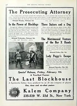 ![]() Advertising published by The Moving Picture World, Vol 15, p 338. | |
