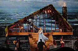 "The Last Great American Dynasty" narrates the story and satirizes the vilification of Rebekah Harkness, an American socialite who had inhabited Swift's mansion Holiday House in Watch Hill, Rhode Island.[13][14] It is structured similar to a lyrical ballad: it follows an abab rhyme scheme and a four-beat line.[15] Written in a townsfolk third-person narrative, it details the following: Rebekah West, a middle-class divorcée from St. Louis, married William "Bill" Harkness in 1947, who was the heir to Standard Oil, an oil-refining company that was the 19th-century's first and largest multinational corporation in the world. The couple bought a seaside estate in Watch Hill, Rhode Island, and nicknamed it "Holiday House". Bill died of heart attack in 1954, for which Rebekah was blamed by the town. After her then-husband's death, Rebekah inherited his enormous wealth and became one of the wealthiest women in the US.[16][17][18][19]