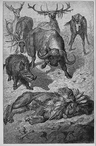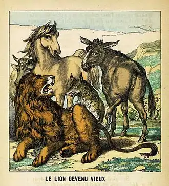 In the fable as Phaedrus tells it, after the lion had grown old and feeble, a boar and a bull took their revenge for past attacks by injuring him. But when a donkey joins in and kicks him, the lion laments that suffering insult from such a base creature is like a second death. Different animals figure in later accounts. For Marie de France in the 12th century, the bull that gores the lion and the ass that kicks him are joined by a fox that bites at his ears. In her version too, it is not simply that they take advantage of his loss of kingly power but that some of his courtiers have now forgotten past favours.[2] In La Fontaine's 1668 version the attacks come from a horse, a wolf and a bull, as well as the ass, but it ends with exactly the same sentiment as in Phaedrus.[3] La Fontaine's choice of animals is influenced by a tag drawn from Horace, a frequent source for him. Used of the natural instinct of self defence, the Latin Dente lupus, cornu taurus petit (the wolf attacks with his teeth, the bull with his horns, Satires II.1.55) had become proverbial.[4]