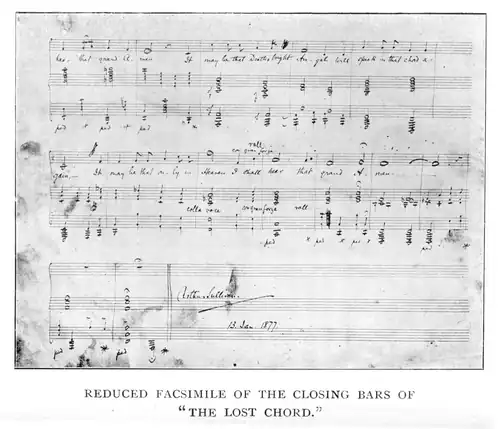 "The Lost Chord" is a song composed by Arthur Sullivan in 1877 at the bedside of his brother Fred during Fred's last illness in Fulham, West London, England. The manuscript is dated 13 January 1877; Fred Sullivan died five days later. The lyric was written as a poem by Adelaide Anne Procter called "A Lost Chord", published in 1860 in The English Woman's Journal.[1]