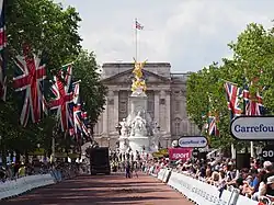 The annual London Marathon finishes on The Mall.[5] It was also the start and finish line for the marathon course, the road race and the race walks of the 2012 Olympic and Paralympic Games. The women's marathon took place on 5 August and the men's Olympic marathon on 12 August. The men's 20 km walk took place on 4 August, with the men's 50 km walk and women's 20 km walk took place on 11 August. The Paralympic marathons were held on 9 September.[6][7] In recent years the Mall has also been repeatedly used as the finishing line for UK cycling events, including the 2012 Olympics Road Races, the Ride London Prudential Classic in 2013, and stage 3 of the 2014 Tour de France. The opening ceremony for the 2019 Cricket World Cup was held on The Mall.[8]