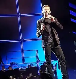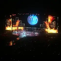 Warren Carlyle was signed as the creative director for the show, while Ashley Wallen choreographed the dancers through intricate dance steps.[20] The large main stage was elevated and set up at the end of the arenas, with a long runway extending from its middle, the pathway ended into a round-shaped front.[21] The tour featured costumes from Tom Ford including, a black snake-print velvet jacket, a metallic silver jacket and an ensemble of white shirt with pleated bib, silk-satin cummerbund and black fedora.[22][23][24][25][26]