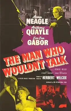 The Man Who Wouldn't Talk is a 1958 British drama film directed by Herbert Wilcox, starring Anna Neagle, Anthony Quayle, Zsa Zsa Gabor, Dora Bryan, John Le Mesurier and Lloyd Lamble.[2][3] It was written by Edgar Lustgarten from a story by Stanley Jackson.