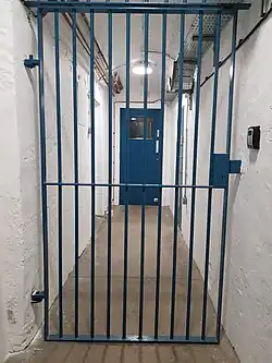 Other notable features of the original design include the central staircase with rising handrails, a rare dog gate at the top of the first flight of the mains staircase, the Modillion cornice, and an unusual sundial above the front door with the date 1707. The gate piers on the wall of the front court have large stone-carved pineapples which were ostentatiously fashionable at the time. In the cellars is an old window to what was probably the cook's room off the central passageway and which was said by Martin Roberts of Pevsner Guides on a visit in 2016 to likely be of about 1650, and therefore to pre-date the house and to have been reused from an older cottage.[11] The vaulted wine cellars were converted in around 1974 into holding cells and a custody police office for the magistrates’ court, and a barred security gate was installed in the central corridor, and these features are still intact