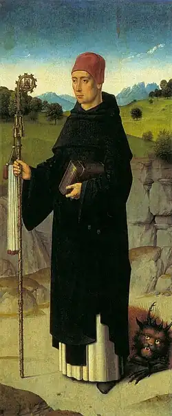 On the side panels two figures are shown facing inward: left, the Church Father Jerome and on the right is Bernard of Clairvaux, founder of the Cistercian Order wearing the costume of an abbot.[3] They are shown with their saintly attributes, namely a lion with Jerome, and crouching at the feet of Bernard, a devil in chains who represents the torments that the saint had resisted. While these two historical figures have virtually no link with the Erasmus, subject of the central panel, "their status as scholars would have made them admired by the members of the Confraternity, which had close ties with Louvain academic circles."[3]