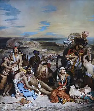 Scenes from the Massacre at Chios (French: Scènes des massacres de Scio) is the second major oil painting by the French artist Eugène Delacroix.[A] The work is more than four meters tall, and shows some of the horror of the wartime destruction visited on the northern Aegean Sea island of Chios in the 1822 Chios massacre. A frieze-like display of suffering characters, military might, ornate and colourful costumes, terror, disease and death is shown in front of a scene of widespread desolation.
