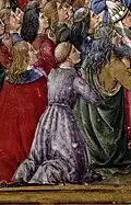 The gilded frame surrounding the scene depicts episodes from the life of Jesus and his Passion. On the left are the Joyful Mysteries: from top to bottom, the Annunciation, the Nativity, the Epiphany, the Circumcision, Christ among the Doctors and, at the bottom left of the page, the Baptism. This last scene is a reproduction of the Baptism of Christ painted by Andrea del Verrocchio and Leonardo da Vinci. On the right, it's the Passion,[17] beginning with the Last Supper at the bottom right, then, from bottom to top, the Sorrowful Mysteries: La Prière dans le Jardin des oliviers (The Prayer in the Garden of Olives), the Arrest of Jesus, Jesus before Pilate, the Flagellation, to the Christ Carrying the Cross and the Crucifixion for the main scene.[16][18]