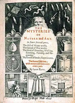 The Mysteries of Nature and Art is a book by John Bate written in 1634. The book acts as a practical guide for amateur scientific experiments, and is divided into four sections: Water Workes; Fyer Workes; Drawing, Colouring, Painting and Engraving; and Divers Experiments.[1] It inspired Isaac Newton during his younger years, in particular the section on fire Drakes, kites with firecrackers tied to their tails.[1] It contains one of the earliest depictions of fireworks and their preparation to be detailed in the English language, in a similar manner to the preceding De la pirotechnia.