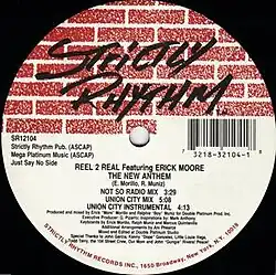 "The New Anthem" is a 1992 song recorded by the American music project Reel 2 Real featuring Erick "More" Morillo, which marked the act's first number-one single on Billboard's Dance Club Songs Chart.[1] The single was written and produced by Morillo and Ralphie "Boy" Muniz. The single features two versions: The A side was listed as the "Funky Budda Side." The B side was the "Just Say No Side."