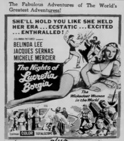 The Nights of Lucretia Borgia is a 1959 Italian historical drama film. It was also known as Le notti di Lucrezia Borgia and Nights of Temptation.[1] It was one of a series of sexually aggressive characters Belinda Lee played in European movies.[2]
