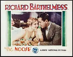 The Noose is an American silent drama film adaptation of the Willard Mack play The Noose, which was released in 1928 by First National Pictures. It stars Richard Barthelmess, Montagu Love, Robert Emmett O'Connor, and Thelma Todd. It was directed by John Francis Dillon and Richard Barthelmess's performance was nominated for the Academy Award for Best Actor. The movie was adapted by Garrett Graham and James T. O'Donohoe from the play. The play was also the basis of the Paramount Pictures film I'd Give My Life (1936).[1]