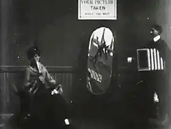 Undaunted, the old maid preens in the mirror, which then cracks. When the photographer returns, he's upset to see the mess in his studio, but he seats the woman and prepares to take her picture. As she gazes at the lens, the camera explodes in a shower of dust, comically startling the old maid.[3]