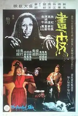 "The Painted Skin" has been adapted or represented in film, television, and cartoons on numerous occasions. The long list of adaptations underscore the story's enduring legacy; in particular, it is written to have inspired generations of filmmakers.[10] One of the earliest film adaptations of the story is Bow Fong's Huapi (1965).[20] [21] A rumoured 1970s Painted Skin film was reportedly banned in China after a short run at the box office because of its overly intense horror scenes – it is claimed that some audience members died of fright. Its existence, however, has yet to be proven.[1] King Hu's last film was a "faithful" adaptation of "The Painted Skin", released in 1992.[22] Other film adaptations of the story include Painted Skin (2008), and its sequel Painted Skin: The Resurrection (2012).