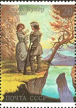 The Pathfinder shows Natty at his old trick of guiding tender damsels through the dangerous woods, and the siege at the blockhouse and the storm on Lake Ontario are considerably like other of Cooper's sieges and storms. Natty, in this novel commonly called the Pathfinder, keeps in a hardy middle age his simple and honest nature, which is severely tested by his love for a nineteen-year-old young woman, Mabel Dunham. She is a conventional heroine of romance. A certain soft amiability about her turns for a time all the thoughts of the scout to the world of domestic affections. More talkative than ever before, he reveals new mental and moral traits. With the same touch of realism which had kept Uncas and Cora apart in The Last of the Mohicans, Cooper separates these lovers, and sends Natty's romantic interest to the arms of a younger suitor, restoring the hero to his home in the wilderness.[1]