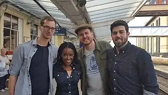 Dan Jackman, Diane-Louise Jordan, Paul Mirfin, Dom Cottrill at Harrogate Railway Station during filming for BBC1 Songs of Praise, May 2016