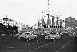 - The Beast from 20,000 Fathoms (1953)[12][13] featured The Cyclone Racer in the climax, when the stop-motion beast destroys a model of the coaster in split-screen with live action intercut with live action scenes from the coaster parking lot, entrance ramp and loading platform.