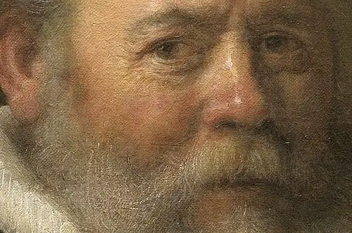 In the dim brown background, with only a few, barely visible books on a table, the preacher seems to take up an imposing but nonostentatious volume. Rembrandt depicted the Amsterdam preacher almost life-size, in an extremely sober way. He sits relaxed on a low wooden armchair. He was painted three-quarter view. Swalmius doesn't look at the viewer penetratingly. The character's appearance gives the painting a relaxed ambience of confidentiality. His eyes are kind, his nose rubicund. Rather than showing his wisdom, his long white beard enhances the friendliness of his appearance, especially to the modern viewer. There was probably a relationship between the painter and the sitter. As mentioned, Rembrandt knew his client and his family personally.[1][5]