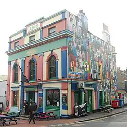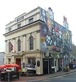 The most iconic feature of the pub is a mural painted on the side. Originally, the wall was known for its Banksy artwork Kissing Coppers appearing in 2004, along with a mural of the late BBC Radio 1 DJ John Peel. In 2013, a mural depicting 26 deceased musicians, the actor Oliver Reed and footballer George Best was added to the wall by local graffiti artists Req and Sinna One.[1] These depictions are mostly monochrome, set against a vividly multicoloured background. The following musicians were painted: