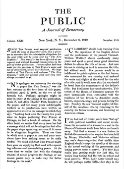 1. ^ "The Public: A Journal of Democracy". The Public. 22 (1125): 1127. December 6, 1919. Retrieved November 2, 2020.