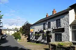 The two-storey pub is built of limewashed stone, with painted stone dressings, and a slate roof. The original part has three bays, a central doorway with a moulded hood, and mullioned windows containing casements and fixed lights. In the 19th-century extension, to the left, are a doorway and two windows.[1]