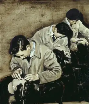 The Pupils shows three young men in factory overalls, sitting or standing in a diagonal row. Each man looks alike and bends over an upturned head in front of him. Two of the men touch the faces of the heads as if studying them or applying something to them. The two foremost men have a thin, vertical white line stretching between one of his eyes and the head below. The area surrounding the heads is dark, and it is unclear if they are attached to bodies.[1][2] Michaël Borremans made The Pupils in 2001.[3]