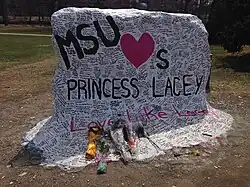 The Rock was the site of a weeks-long tribute to 8-year-old cancer victim Lacey "Princess Lacey" Holsworth in 2014. Holsworth befriended MSU basketball forward Adreian Payne during her cancer treatment at Sparrow Hospital, and her story gained national media attention as the Spartans basketball team advanced during the 2014 March Madness tournament. Following Holsworth's death on April 8, 2014, the Rock became a tribute to her, with handwritten messages left by the MSU community, including Payne and longtime MSU basketball coach Tom Izzo. With the magnitude of Holsworth's death, some argued for the Rock to become a permanent memorial, including MSU graduate and Detroit News sports writer Tony Paul.[11] The memorial to Holsworth remained on the Rock until April 21.[10] Payne died in 2022 at the age of 31, and following his death, the Rock was repainted to read "Adreian + Lacey: together again."[12][13]