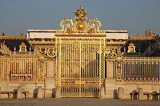 This gate was the work of several ironworkers associated with its elaboration and installation: Luchet, Marie, Godignon, and Belin, considered the best professionals in their field at the time. Gilded and ornamented with rich pillars or pilasters, the gate opened through two portals that gave onto two lateral courtyards called "Cours des Princes" and "Cours de la Chapelle." The old gate then extended between the columns of the pavilions of the side wings located at the end of the castle, which the Dufour pavilions and the Gabriel wing have now replaced. Then, this gate curved in a quarter circle on the courtyard of Honor to end on two stone sentry boxes, which were used as a guardhouse.[1]