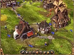 Whether playing in single-player or multiplayer mode, each game begins the same way; the player has one building, a warehouse/headquarters, in which are a set amount of raw materials and tools.[16][17] The basic gameplay revolves around serfs (the titular "settlers") who transport materials, tools and produce, and who populate and perform the requisite task of each building. As the player constructs buildings and thus requires settlers to occupy them, the settlers automatically emerge from the warehouse as needed.[18] As the settlement continues to grow in size, the warehouse's quota of settlers will eventually be reached, and the player will need to build an additional warehouse to generate more settlers. At no point does the player directly control any individual settler - instead, general orders are issued (such as ordering the construction of a building), with the AI handling the delegation of orders to specific settlers.
