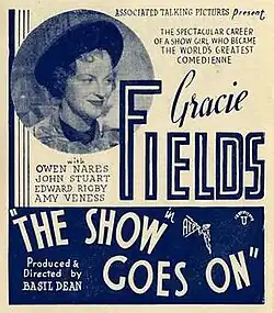 The Show Goes On is a 1937 British musical comedy film directed by Basil Dean and starring Gracie Fields, Owen Nares and John Stuart.