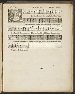 The English composer Orlando Gibbons (1583–1625) published his First Set of Madrigals and Motets of 5 parts in 1612;[1] its opening song is "The Silver Swan",[2] printed as The filuer [sic] Swanne, who liuing had no note.[3] Published in London by Thomas Snodham, the assignee of William Barley, the Madrigals and Motets forms the core of the composer's secular vocal music.[4] It is among Gibbons's few publications within his lifetime, alongside six works in the keyboard set Parthenia of c. 1612; two songs in The Teares and Lamentatacions of a Sorrowfull Soule vocal collection published by William Leighton in 1614; and nine keyboard pieces in the solely-Gibbons set: Fantzies of III. Parts.[5]