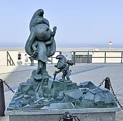 The Smurfs are among the many Belgian comics characters to jokingly have a Brussels street named after them. The Rue des Sables/Zandstraat has a commemorative plaque with the name Rue Schtroumpfs/Smurfstraat placed under the actual street sign.[13] Close to the Smurfs studios in Genval (in the province of Walloon Brabant), a bronze statue of the Smurfs is sited in a traffic circle. In 2003, a statue of a Smurf sculpting a larger statue of Smurfette was unveiled in Middelkerke, on the Belgian coast. It was sculpted by Monique Mol.[14]