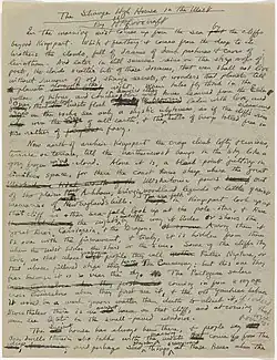 "The Strange High House in the Mist" is a short story by H. P. Lovecraft. Written on November 9, 1926, it was first published in the October 1931 issue of Weird Tales. It concerns a character traveling to the titular house which is perched on the top of a cliff which seems inaccessible both by land and sea, yet is apparently inhabited.