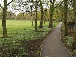 The Stray is a long area of public parkland in the centre of Harrogate, North Yorkshire, England, comprising 200 acres (81 ha) of contiguous open land linking the spa town's curative springs and wells. The contiguous area of land, not all of which is officially designated part of The Stray, forms an approximately U-shaped belt from the Cenotaph on the north west point of the U, down the A61 road, along a broader southern belt of fields, enclosing the building of Church Square, and up to the north east tip of the U at The Granby. The Stray includes the site of Tewit Well, marked by a dome.