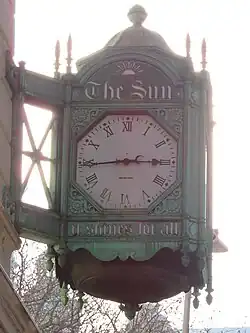 From 1914 to 1919, The Sun moved its offices to 150 Nassau Street, one of the first skyscrapers made of steel, and one of the tallest in the city at the time. The tower was close to the New York Times Building, Woolworth Tower, and New York City Hall. In 1919, The Sun moved its offices to the A.T. Stewart Company Building, site of America's first department store, at 280 Broadway between Reade and Chambers Streets.[30] 280 Broadway was renamed "The Sun Building" in 1928.[30][31] A clock featuring The Sun's name and slogan was built at the corner with Broadway and Chambers Street.[32]