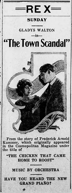 The Town Scandal is a 1923 American comedy film directed by King Baggot from a screenplay written by Hugh Hoffman. It was based on the novel The Chicken That Came Home to Roost by Frederic Arnold Kummer. The film stars Gladys Walton, Edward Hearn, Edward McWade, Charles Hill Mailes, William Welsh and Billy Franey. The film was released on April 16, 1923, by Universal Pictures.[1][2][3]