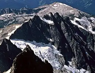 Most weather fronts coming off the Pacific Ocean travel northeast toward the Cascade Mountains. As fronts approach the North Cascades, they are forced upward by the peaks of the Cascade Range (orographic lift), causing them to drop their moisture in the form of rain or snowfall onto the Cascades. As a result, the west side of the North Cascades experiences high precipitation, especially during the winter months in the form of snowfall.Because of maritime influence, snow tends to be wet and heavy, resulting in high avalanche danger.[3] During winter months, weather is usually cloudy, but, due to high pressure systems over the Pacific Ocean that intensify during summer months, there is often little or no cloud cover during the summer.[3] This climate supports a small unnamed glacier on the north slope below the steep walls of the north face.
