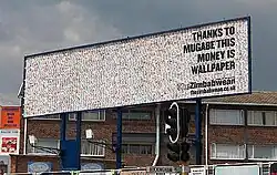 The Trillion Dollar Campaign was launched in March 2009. Banknotes of denominations between Z$1,000,000 and Z$100,000,000,000, each bearing one of four English-language advertising slogans, the website address for The Zimbabwean, its logo, and its tagline "A voice for the voiceless", were handed out to motorists stopped at busy intersections in Johannesburg.[3] Rolls of the altered currency were mailed to industry figures, media personalities, and politicians. Posters were put up at every location selling copies of the newspaper in the city, murals 1.5 m (4.9 ft) tall by 5 m (16 ft) wide[9] were pasted across walls along streets with heavy foot traffic, and billboard spaces were purchased overlooking several highways. All were composed of hundreds or thousands of banknotes, which could be detached and taken home by members of the public.[3][6] The four slogans used in the campaign were "Fight The Regime That Has Crippled A Country",[10] "It's Cheaper To Print This On Money Than Paper",[11] "Z$250 000 000 Cannot Buy The Paper To Print This Poster On",[12] and "Thanks to Mugabe This Money Is Wallpaper".[13]
