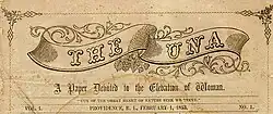 In 1853, The Una, a paper devoted to the enfranchisement of woman, owned and edited by Paulina Wright Davis, was first published in Providence, Rhode Island.[1][2] The Una was the first paper focused on woman suffrage, and the first distinctively woman's rights journal ever published.[3] Its mystical name signified "truth", to be used as a constant suggestion of fidelity to all. The Una had many notable correspondents such as William H. Channing, Elizabeth Peabody, Thomas Wentworth Higginson, Rev. A. D. Mayo, Dr. William Elder, Ednah D. Cheney, Caroline H. Dall, Fanny Fern, Elizabeth Oakes Smith, Frances D. Gage, Hannah Tracy Cutler, Abby H. Price, Marion Finch, of Liverpool, Hon. John Neal, of Portland, Lucy Stone, and Elizabeth Cady Stanton.[4] For nearly three years Davis continued The Una, doing so entirely at her own expense. It took the broadest ground claimed of that day: individual freedom in the State, the Church, and the home; woman's equality and suffrage as a natural right.[3]