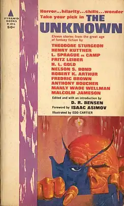 The Unknown is an anthology of fantasy fiction short stories edited by D. R. Bensen and illustrated by Edd Cartier, the second of a number of anthologies drawing their contents from the American magazine Unknown of the 1930s-1940s. It was first published in paperback by Pyramid Books in April 1963. It was reprinted by the same publisher in October 1970, and by Jove/HBJ in August 1978[1] A companion anthology, The Unknown Five, was issued in 1964.